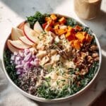 This Autumn Grain Bowl is a vibrant, nutritious dish featuring nutty farro cooked in vegetable broth, roasted butternut squash, bell pepper, and apple, combined with sautéed aromatics, dried cranberries, pecans, and fresh baby spinach. Tossed in a tangy apple cider vinaigrette and finished with optional toppings like goat cheese and pomegranate seeds, it’s a comforting and wholesome meal perfect for cozy fall days.