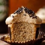 The image shows a close-up of a cupcake cut in half, revealing two layers. The bottom layer is a soft, light brown cake with a porous texture, while the top layer is a thick, smooth, light tan frosting. The frosting is decorated on top with dark brown, small, cylindrical sprinkles. The cupcake sits on a dark brown cupcake liner, and the background is a soft blur with warm tones. The focus is sharp on the cupcake's textures. Photo taken with an iphone --ar 4:5 --v 7