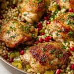 This Baked Zaatar Yogurt Chicken recipe features tender boneless chicken thighs or breasts marinated in a flavorful blend of Greek yogurt, zaatar seasoning, lemon, and garlic, then baked to golden perfection. The marinade tenderizes the chicken while infusing it with vibrant Middle Eastern flavors, making it a perfect weeknight dinner served alongside couscous and warm pita bread.