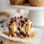 A close-up of a single chocolate chip muffin partially peeled from its white paper liner, showing a moist and crumbly texture with melted chocolate chips visible throughout, the top layer featuring large shiny chocolate chips that are slightly melted and glossy, sitting on a white marbled surface; in the background, there are more muffins on a white cake stand, softly blurred. photo taken with an iphone --ar 4:5 --v 7