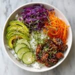 A white bowl on a white marbled surface holds a colorful dish with five main layers arranged side by side on a bed of white rice that covers the bottom half of the bowl. On one side are slices of bright green avocado, sprinkled with sesame seeds, resting on shredded deep purple cabbage. Next to the avocado are thin round slices of fresh green cucumber, also topped with sesame seeds. On the opposite side of the bowl is a pile of thin, bright orange carrot strips. Finally, glossy pieces of chicken covered in a shiny dark reddish-brown sauce with green onion pieces and sesame seeds are placed next to the rice in the bowl. Some small green herbs are scattered on top and around the bowl. photo taken with an iphone --ar 4:5 --v 7