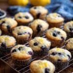 A wire cooling rack filled with about twenty small blueberry muffins arranged tightly in rows. Each muffin has a light golden top dotted with dark purple blueberries and small bits of bright yellow lemon zest scattered on the surface. The muffins sit in paper liners with a black and white pattern. In the blurred background, two whole yellow lemons and a blue cloth add soft color contrast on a wooden table. The overall scene is warm and inviting with soft natural light. photo taken with an iphone --ar 4:5 --v 7
