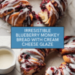 Keywords: Blueberry Monkey Bread, pull-apart bread, sweet bread, cinnamon sugar bread, cream cheese glaze, breakfast bread, blueberry dessert