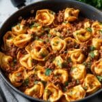 This Cheesy Beef Enchilada Tortellini is a hearty and flavorful one-pan meal combining seasoned ground beef, creamy enchilada sauce, and tender cheese tortellini. Topped with melted mozzarella and garnished with fresh cilantro, it offers a comforting Tex-Mex twist on classic pasta dishes, perfect for a quick weeknight dinner.