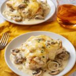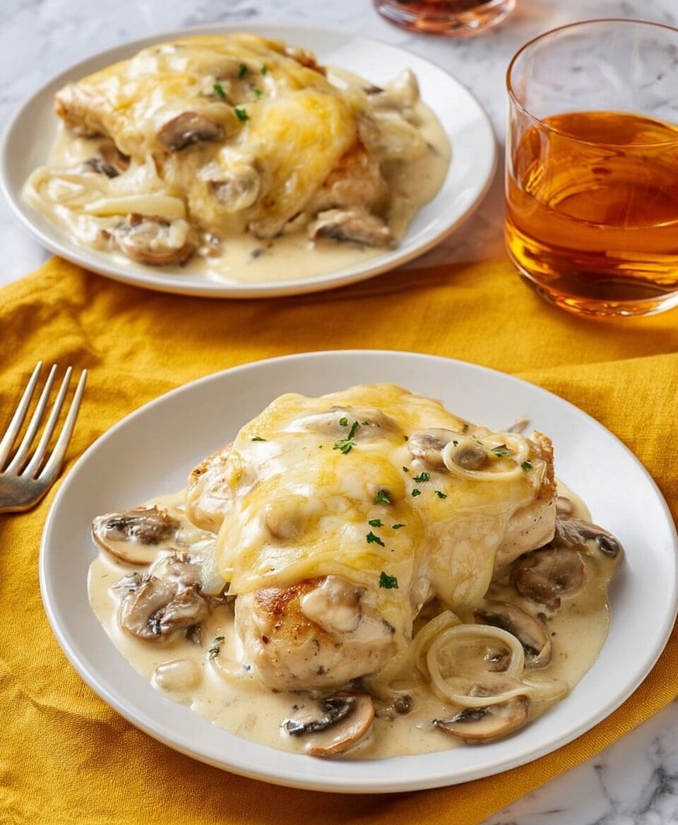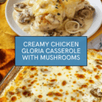 Chicken Gloria is a decadent, creamy baked chicken dish featuring tender, butterflied chicken pieces browned and baked with sautéed mushrooms, sweet onions, sherry-infused cream sauce, and melted Muenster cheese for a rich and comforting meal.