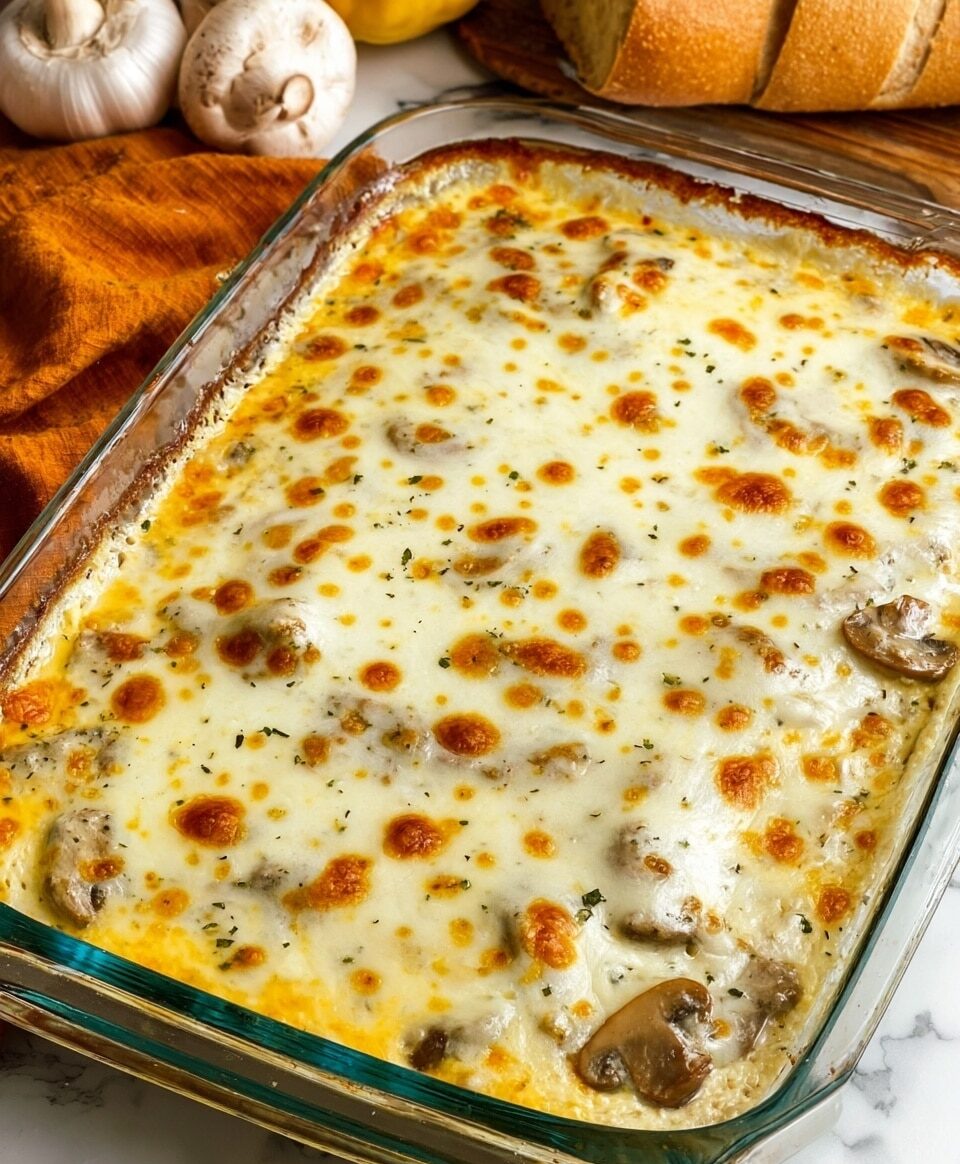 - Combine sauce and chicken: Pour the creamy sauce over the chicken and mushrooms in the casserole dish.