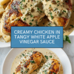 This Chicken in White Apple Vinegar Sauce is a flavorful and creamy dish featuring tender seared chicken breasts simmered in a tangy white apple vinegar sauce enriched with butter, garlic, Parmesan cheese, and fresh lemon juice. The dish balances sharp vinegar acidity with the richness of cream and cheese, making a perfect main course for any dinner.