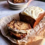 A thick slice of moist banana bread with a dark brown crust and a light golden-brown inside showing bits of nuts and swirls of cinnamon, placed next to the remaining loaf on brown parchment paper on a wooden board. The top of the loaf is covered with a thick, creamy layer of white cream cheese frosting that has smooth, swirled texture. In the background, there are stacked white bowls with dark rims slightly out of focus, all set on a white marbled surface. photo taken with an iphone --ar 4:5 --v 7
