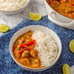 A white bowl sits on a blue and white patterned cloth over a white marbled surface, filled halfway with white fluffy rice on one side and a creamy orange chicken curry with red bell pepper slices and small green herb bits on the other side; nearby is another white bowl filled with plain white rice, two lime wedges placed on the marbled surface in front, and a large white pot containing more of the same orange chicken curry with visible red peppers. photo taken with an iphone --ar 4:5 --v 7