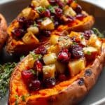 Enjoy the comforting flavors of fall with these Cranberry Apple Twice-Baked Sweet Potatoes. Baked sweet potatoes are filled with a warm, spiced cranberry and apple mixture, then baked again to meld the flavors perfectly. This dish makes a delightful side or a hearty vegetarian main that’s both sweet and savory.