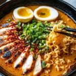 Creamy Garlic Chicken Ramen is a comforting and flavorful dish featuring tender chicken breasts simmered in a garlicky, creamy broth with ramen noodles and fresh vegetables. This easy-to-make recipe combines rich heavy cream, fragrant garlic and ginger, and a hint of spice, making it the ultimate bowl of cozy homemade ramen.
