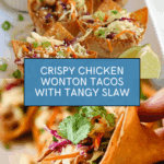 Store leftover chicken and slaw separately in airtight containers in the refrigerator for up to 2 days. Keep wonton shells in a sealed container at room temperature to maintain their crispness. Reheat chicken gently in a skillet or microwave. Assemble tacos fresh to ensure the wrappers stay crispy.