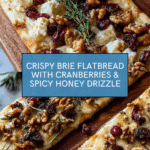 This Crispy Flatbread with Brie, Cranberries, and Toasted Walnuts is an irresistible blend of creamy cheese, tart dried cranberries, crunchy walnuts, and a spicy hot honey drizzle. Perfect for a sophisticated appetizer or a savory snack, the flatbread is baked until golden and bubbly, then finished with a warm honey infused with red pepper flakes and fresh thyme. A simple yet elegant dish bursting with flavor and texture.