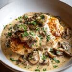 A large piece of golden brown chicken sits in the middle of a white bowl, covered with a creamy mushroom sauce that has visible slices of cooked mushrooms in light and dark brown shades. The thick sauce pools around the chicken, spreading evenly to the edges of the bowl. Bright green chopped herbs are sprinkled on top of the chicken and sauce, adding fresh color contrast. The bowl is placed on a white marbled surface that gives a clean and bright background to the dish. photo taken with an iphone --ar 4:5 --v 7