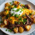 This Crockpot Loaded Steak and Potato Bake is a hearty and comforting one-pot meal perfect for busy days. Tender cubes of beef steak and diced potatoes slow-cooked to perfection in a savory broth with Worcestershire sauce and seasonings. Finished with creamy sour cream, melted cheddar cheese, and fresh green onions for a deliciously satisfying dish.
