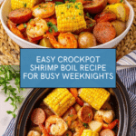 Keywords: Crockpot shrimp boil, slow cooker shrimp boil, Cajun shrimp recipe, seafood boil, andouille sausage boil, easy crockpot dinner