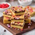 A stack of six square cake bars with a golden-brown top layer sprinkled with colorful red, pink, and white candy pieces. Each bar has two visible layers: a thick yellow cake base and a dark brown chocolate layer in the middle. The bars are placed on a dark wooden board, with extra candy pieces scattered around on a white marbled surface. In the background, there are blurred white bowls, one with more small red candies. Photo taken with an iphone --ar 4:5 --v 7