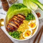 This Easy Chicken Ramen recipe features tender, marinated chicken breasts cooked to perfection and served in a flavorful chicken broth with savory soy sauce and mirin. Combined with soft boiled eggs, fresh bok choy, and scallions, this ramen bowl is elevated with a rich egg yolk and mayonnaise mixture that creates a luxuriously silky broth base. Perfect for a comforting and hearty meal that comes together quickly on the stovetop.