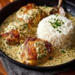 This Easy Creamy Smothered Chicken and Rice Dinner is a comforting, hearty one-pan meal featuring tender seared chicken breasts simmered in a rich and velvety creamy sauce served over fluffy homemade rice. Infused with garlic, onions, and seasoned with paprika and thyme, it’s a perfect weeknight family dinner that’s simple to make yet full of delicious flavors.