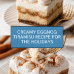 Eggnog Tiramisu is a festive, creamy dessert that combines the classic Italian tiramisu with the rich, spiced flavors of eggnog. This no-bake treat layers ladyfinger biscuits soaked in coffee and rum with a luscious mascarpone and eggnog cream, topped with a dusting of cinnamon and nutmeg. Perfect for holiday gatherings, this dessert is chilled to develop its signature velvety texture and indulgent taste.