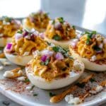 Elote Deviled Eggs with Chipotle Mayo are a vibrant and flavorful appetizer inspired by the classic Mexican street corn. These deviled eggs combine creamy yolk filling with zesty lime, smoky chili powder, and a touch of cilantro, topped with crumbly cotija cheese, spicy jalapeño, and a drizzle of smoky chipotle mayo for a fiesta-worthy bite.