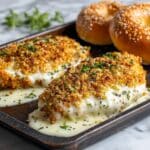 Everything Cream Cheese Chicken features juicy, boneless chicken breasts stuffed with a delicious blend of garlic and herb cream cheese, Parmesan, and sharp cheddar. Coated in crispy bagel crumb breadcrumbs seasoned with classic everything bagel spice and baked to golden perfection, this dish packs bold flavor with a crunchy crust and creamy cheese filling.
