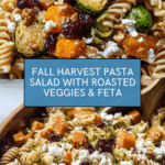 Keywords: fall pasta salad, roasted vegetables, butternut squash salad, Brussels sprouts salad, autumn salad, pasta salad with cranberries, feta pasta salad