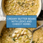 Keywords: butter beans, cannellini beans, leeks, vegetarian beans recipe, cheesy beans, easy vegetarian meal, stovetop bean dish