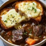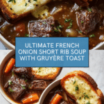 Keywords: French onion soup, short rib soup, Gruyère toast, caramelized onions, hearty soup, fall-apart beef, comfort food