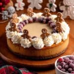 A round cheesecake with a thick, brown crust layer at the bottom and a smooth light brown filling on top is placed on a wooden board. Around the edge of the cheesecake, there is a ring of white whipped cream piped in large swirls. On top of the whipped cream, there are small gingerbread man cookies evenly spaced and groups of frosted red and purple cranberries. In the background, there are small gingerbread figures and Christmas decorations, all set on a wooden surface with a plaid ribbon in the foreground and a white bowl filled with more frosted cranberries on the right side. photo taken with an iphone --ar 4:5 --v 7