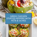 Keywords: Greek stuffed peppers, ground chicken recipe, baked stuffed peppers, healthy stuffed peppers, Mediterranean chicken recipe, feta stuffed peppers