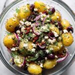 A vibrant and hearty Greek Potato Salad featuring tender baby yellow potatoes, tangy feta cheese, briny kalamata olives, and fresh herbs, all tossed in a zesty herb vinaigrette. Perfect as a refreshing side dish for summer meals or Mediterranean-inspired gatherings.