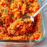 Greek Tomato Rice is a flavorful and aromatic rice dish infused with tomato, garlic, and warm spices such as allspice and cloves. Cooked by first simmering the tomato-spiced broth on the stovetop and then baking the rice in the oven until tender, this comforting side dish combines vibrant Mediterranean flavors with a rich, savory tomato base.