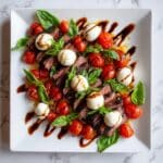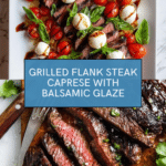 A delicious and fresh Grilled Flank Steak Caprese with Balsamic Dressing combines juicy, marinated grilled steak with a vibrant Caprese salad of cherry tomatoes, fresh mozzarella, and basil, all drizzled with a tangy balsamic glaze for a perfect balance of flavors.