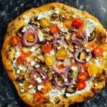 10. Add Toppings: Top with chopped gyro meat, chopped mushrooms, roasted tomatoes and artichokes, slices of bell pepper and onion, and sprinkle crumbled feta cheese evenly.