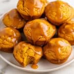 This image shows a white round plate filled with soft, round orange muffins that have a slightly cracked texture on top. Each muffin is drizzled with a shiny, light caramel-colored syrup that pools on the bumpy tops, creating a wet, glossy look that contrasts with the dry muffin surface. Around the plate, there are a few muffins placed directly on a white marbled surface, two of which have a bite taken out, revealing a moist inside that matches the outer orange color. The lighting highlights the muffins' warm glow and syrup shine, making them look fresh and inviting. Photo taken with an iphone --ar 4:5 --v 7