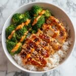 This Healthy Sticky Chicken Bowl combines tender, flavorful chicken with fresh broccoli and fluffy rice, all coated in a deliciously sticky sauce. Topped with a spicy mayo drizzle and toasted sesame seeds, it’s a satisfying and vibrant meal perfect for any day of the week.