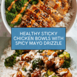 Keywords: sticky chicken bowls, healthy chicken recipe, Asian chicken bowl, spicy mayo chicken, chicken and broccoli bowl, healthy dinner ideas