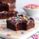This Homemade Cosmic Brownie recipe features rich, fudgy brownies topped with a luscious chocolate ganache and colorful rainbow chocolate chips, delivering a nostalgic and indulgent treat perfect for any occasion.