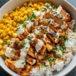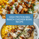 This Irresistible High Protein BBQ Ranch Chicken Bowl is a flavorful, nutritious meal perfect for lunch or dinner. Featuring tender grilled chicken breast seasoned with smoky spices, served over a bed of brown rice or quinoa, and topped with fresh corn, black beans, cherry tomatoes, red onions, shredded greens, and a delicious blend of BBQ sauce and light ranch dressing. Finished with shredded cheddar cheese and optional fresh herbs, this bowl is a satisfying, balanced dish rich in protein and vibrant textures.