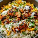 This Irresistible Street Corn Chicken Rice Bowl combines juicy grilled chicken marinated in zesty lime and spices with sweet sautéed corn, creamy avocado, and fluffy jasmine rice. Garnished with fresh cilantro and a dollop of sour cream or Greek yogurt, this vibrant and flavorful bowl is a perfect blend of Tex-Mex inspired ingredients for a wholesome and satisfying meal.