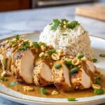 This Irresistible Thai Peanut Chicken recipe combines tender, golden-brown chicken breasts with a rich, creamy peanut sauce infused with garlic, ginger, lime, and a hint of chili flakes. Garnished with fresh green onions and cilantro, this dish offers a perfect balance of savory, spicy, and tangy flavors for a delightful and satisfying meal.