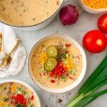 - Serve and Garnish: Ladle the soup into bowls and garnish with chopped green onions, diced tomatoes, chopped pickles, and extra shredded cheddar cheese if desired. Serve warm for the best flavor and enjoyment.