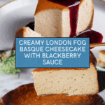 This London Fog Basque Cheesecake is a delightful fusion of creamy Basque-style burnt cheesecake infused with aromatic Earl Grey tea flavors and topped with a fresh homemade blackberry sauce. The cheesecake’s rich, velvety texture contrasts beautifully with the tangy, sweet blackberry sauce, making it a perfect elegant dessert for any occasion.