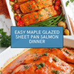 A delicious and easy Maple Glazed Sheet Pan Salmon recipe that combines tender salmon fillets with roasted potatoes, green beans, and cherry tomatoes, all coated in a flavorful maple-Dijon glaze. Perfect for a quick, healthy dinner with minimal cleanup.