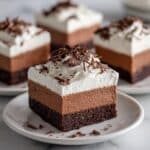The image shows two square pieces of chocolate mousse cake on white plates, each with three layers. The bottom layer is a dark brown chocolate crust with a firm texture, the middle layer is a smooth, rich chocolate mousse in a slightly lighter brown shade, and the top layer is a thick dollop of white whipped cream. On top of the whipped cream and sprinkled over the plate are small, thin chocolate shavings adding texture and decoration. The plates are placed on a white marbled surface. photo taken with an iphone --ar 4:5 --v 7