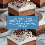 These Mint Chocolate Bars with Mascarpone Whipped Cream combine a crunchy chocolate cookie crust, a creamy peppermint-infused chocolate filling, and a light mascarpone whipped cream topping for a decadent no-bake dessert treat that’s perfect for chocolate and mint lovers.