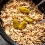 - Shred chicken and mix: Using two forks, shred the cooked chicken directly in the slow cooker, mixing well with the peppers, juices, and melted butter sauce to combine all the flavors before serving.