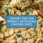 Keywords: chicken orzo recipe, spinach artichoke chicken, one pan chicken dinner, creamy chicken pasta, easy weeknight dinner