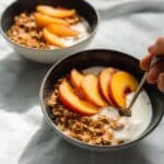 Delight in our Peach Crisp Yogurt Bowls featuring homemade cinnamon-spiced granola and roasted juicy peaches, all layered over creamy vanilla yogurt for a wholesome and satisfying breakfast or snack.